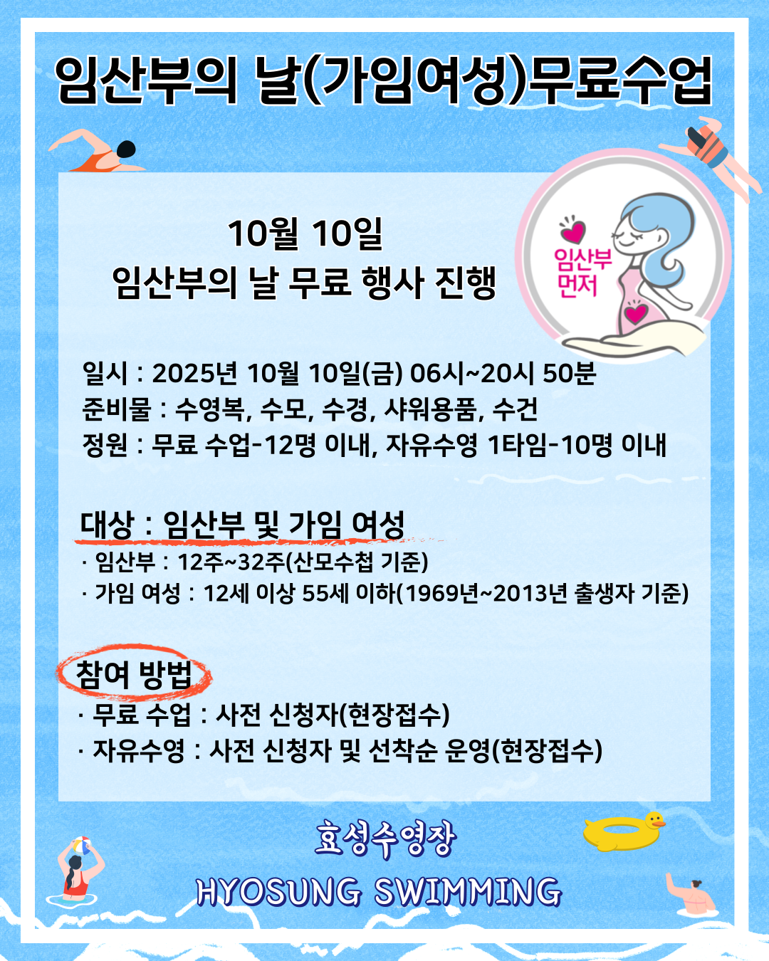 ![]() 임산부의 날 기념 무료 수업 및 자유수영 2025년 10월 10일(금) 06시~20시 50분 자유수영 타임은 '2025년 10월 프로그램' 시간표 확인 후 이용 부탁드립니다. ※ 무료 수업은 오전 11시~11시 50분 진행합니다. |